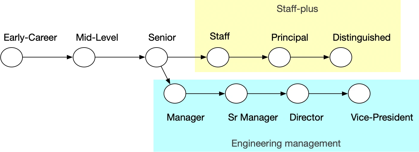 Both tracks start out the same: getting from entry-level to senior. From there, engineers can choose to remain an individual contributor (IC) and pursue the staff-plus track or engineering management which constitutes a classical management pipeline. In a lot of other industries after you get to a certain point you have to go into management to continue advancing in your career. We are fortunate to be in an industry where management is not the only opportunity for career advancement. Not all companies have established career ladders like what is described in the diagram, but the principles apply across companies.