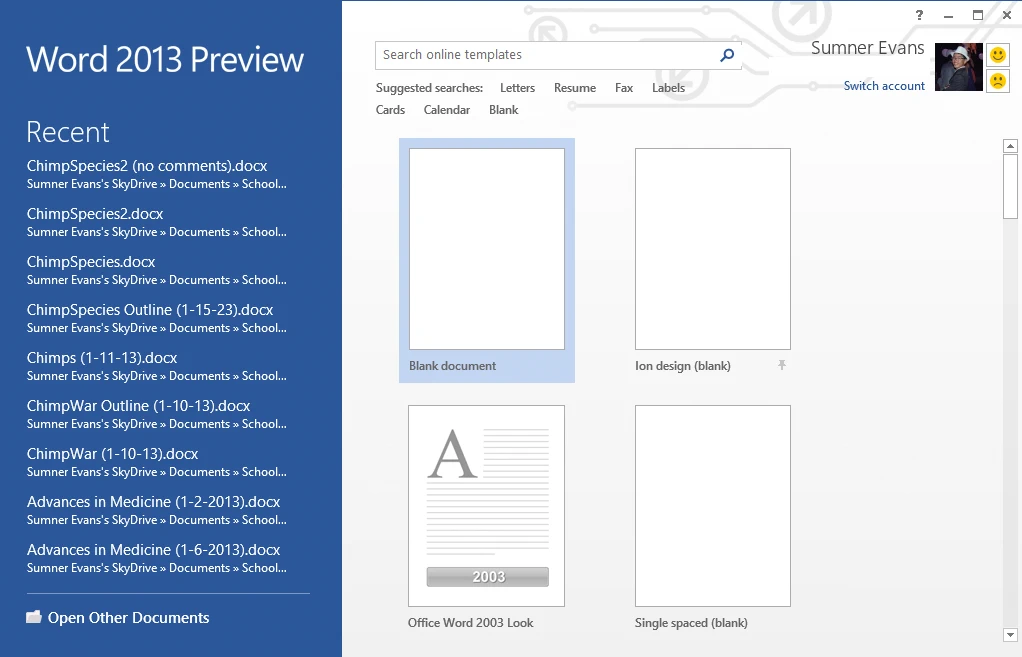 When you open Word, you immediately see your files. The first thing that I noticed about Office 2013 is that it puts your files first. On run, Word, PowerPoint, Publisher, and Access all open to a page with recent files, and a view of all the templates that you can use to create a new document/file. (See picture)