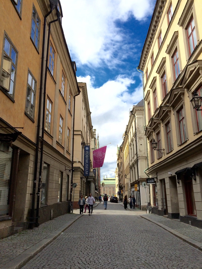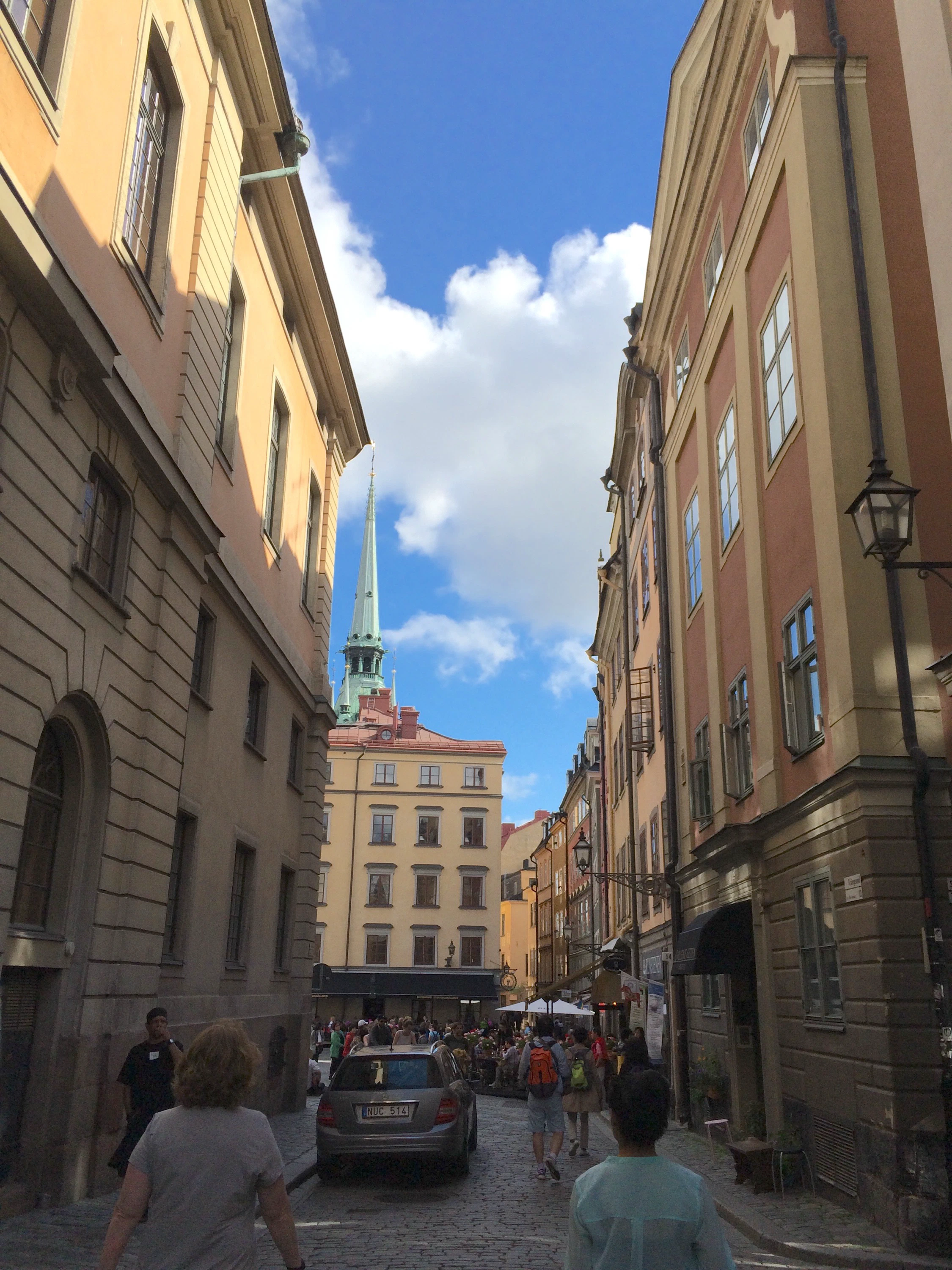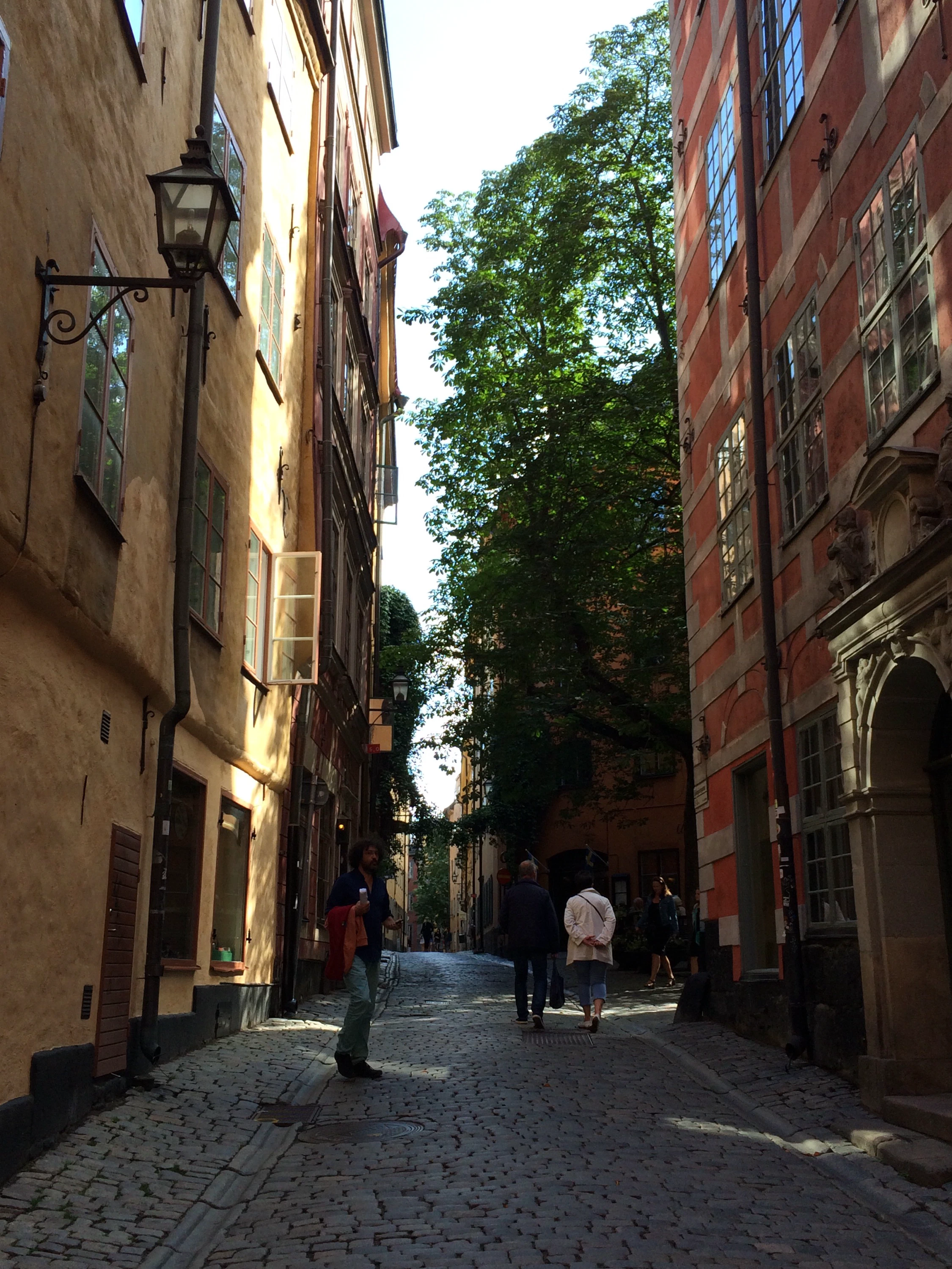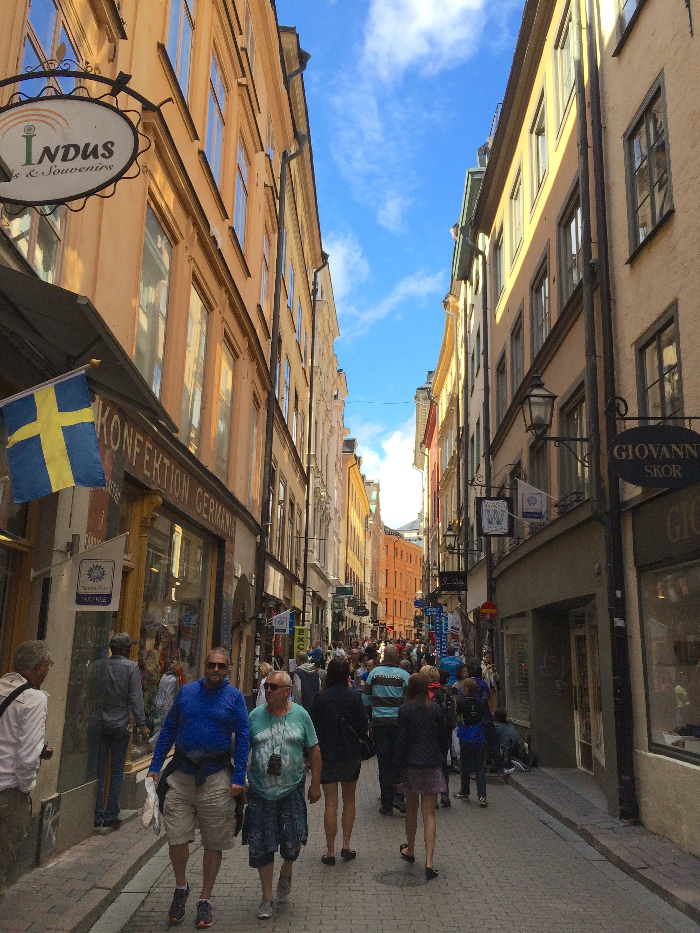 We rode bus #1 into town and got off at the central station (I think we went further than we wanted to, but whatever, we did pretty well considering everything was in Swedish). Then we walked to the subway station. It was very confusing getting in, because mom’s Stockholm card was the only one that worked. (The Stockholm card is a pass that allows you to use all of the public transportation and gives you access to most of the major museums.) The lady at the window said that we just needed to be let in manually. I think that maybe kids are free or something, I don’t know. We had to go down a couple levels to get to the correct platform, but we got on the subway without any issue and made our way to Gamla Stan, the old town. It was a very short metro ride (only one stop), but it was an interesting experience nonetheless.