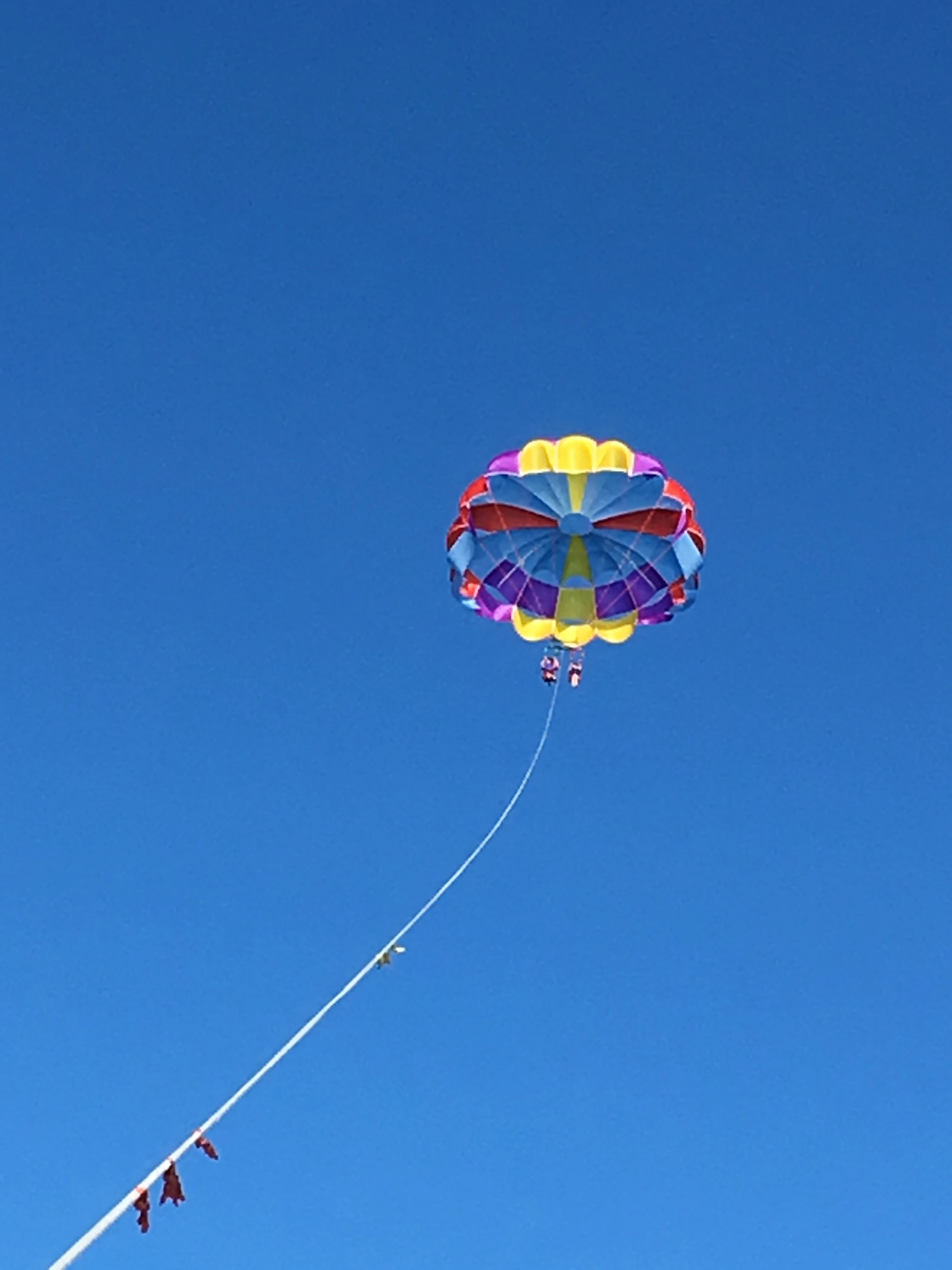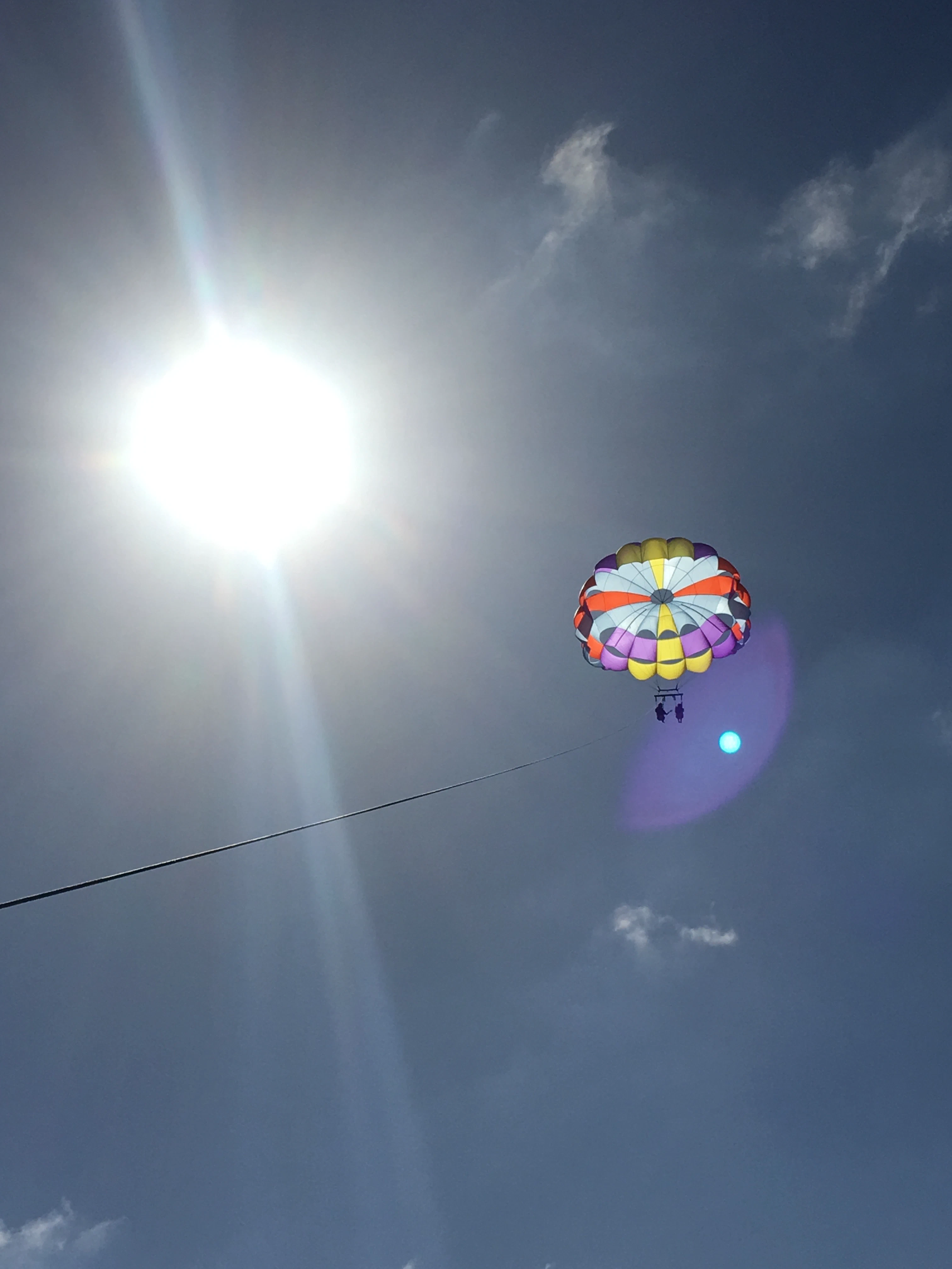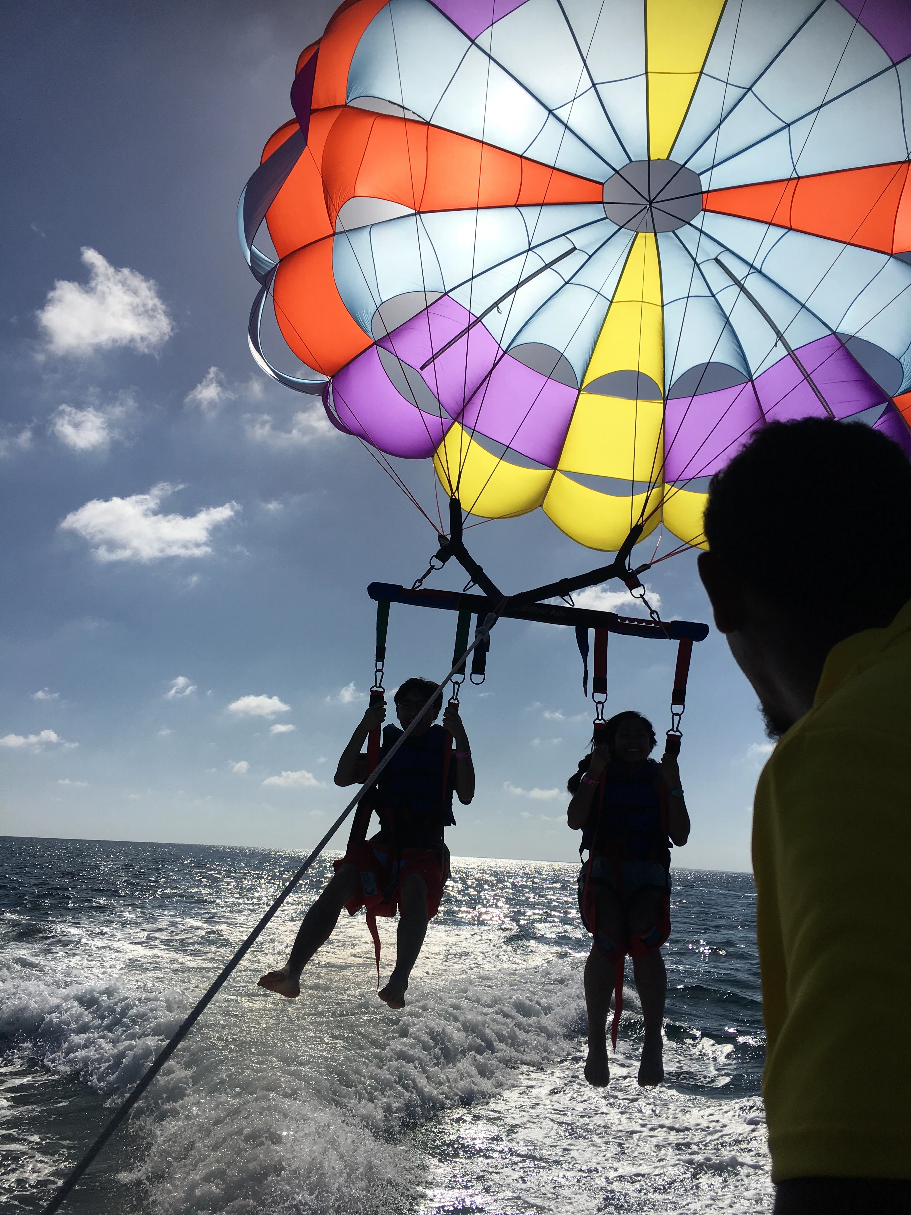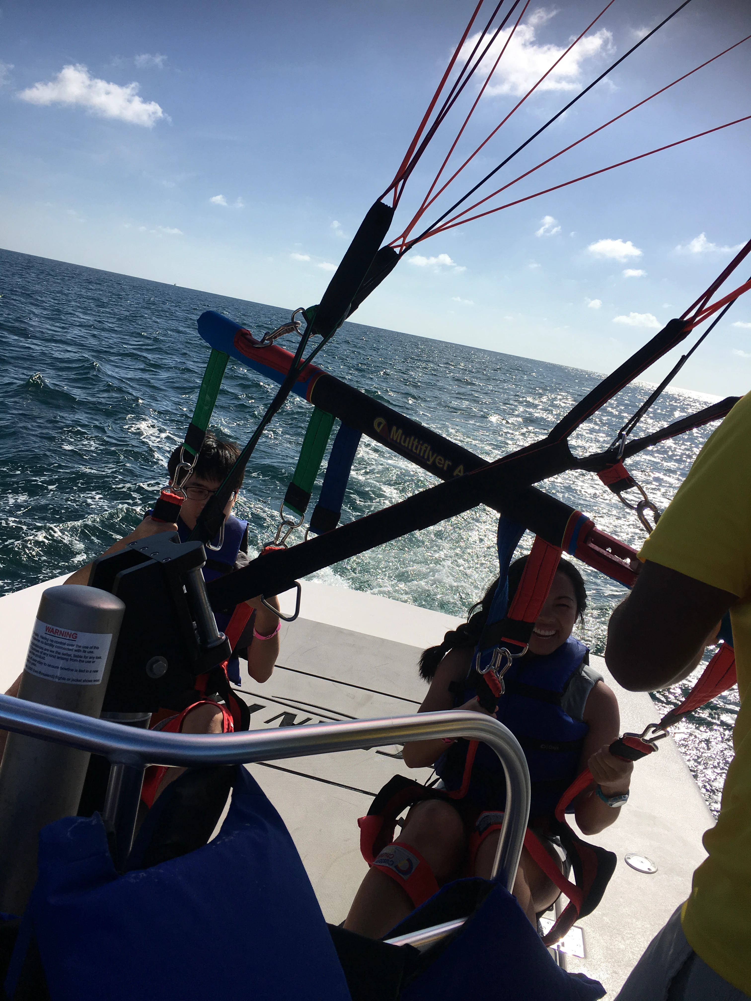 The first thing we did was go paddle boarding. It was pretty fun. I got to the point where I was able to just paddle on one side most of the time, you have to kinda paddle in a circular motion through the water and it works. Then we went into the ocean for a swim and then to the pool to swim. We ate lunch, and after that, Hannah and I went parasailing.