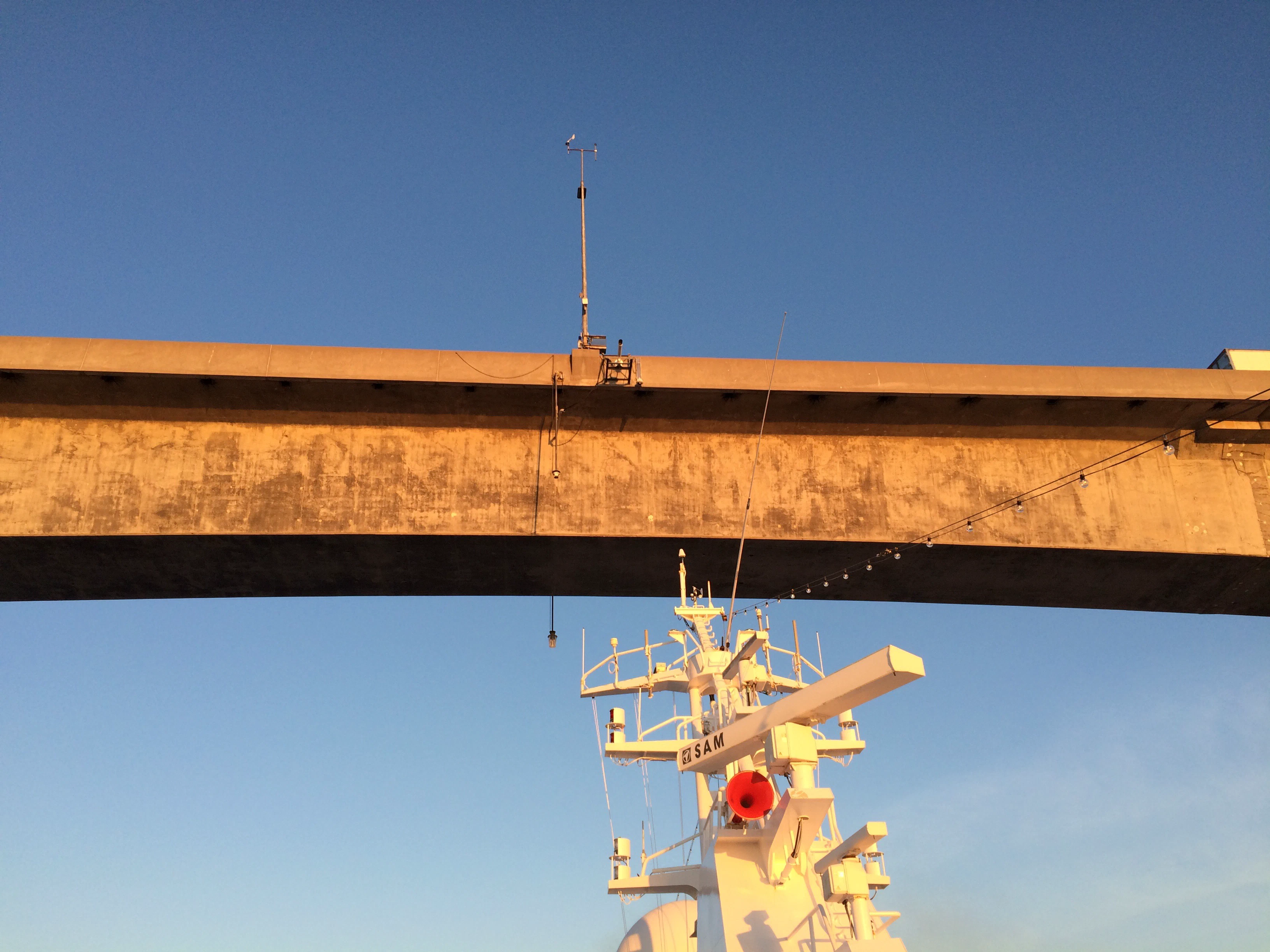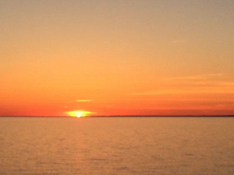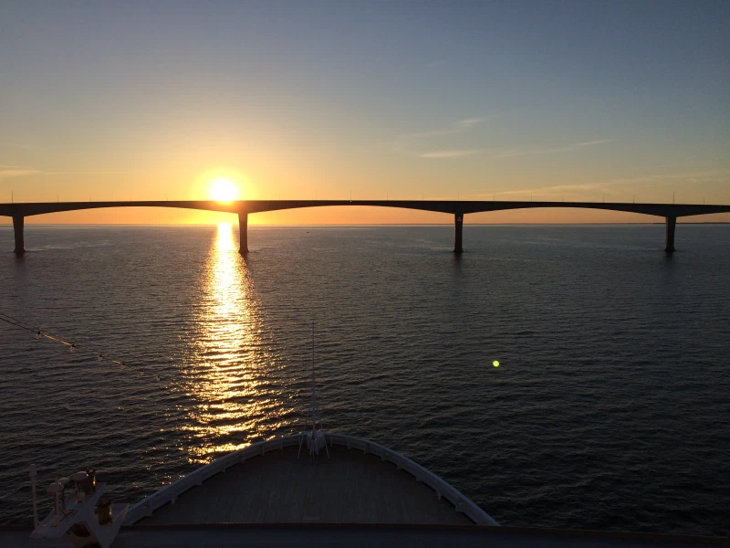 During dinner, we were approaching Confederation Bridge, a 13 km (8 mi) long bridge connecting PEI to mainland New Brunswick. When we got close, the captain’s father and I went up to the top deck and watched us sail under the bridge. While we were up there, I got some great pictures of the sunset and of Confederation Bridge.