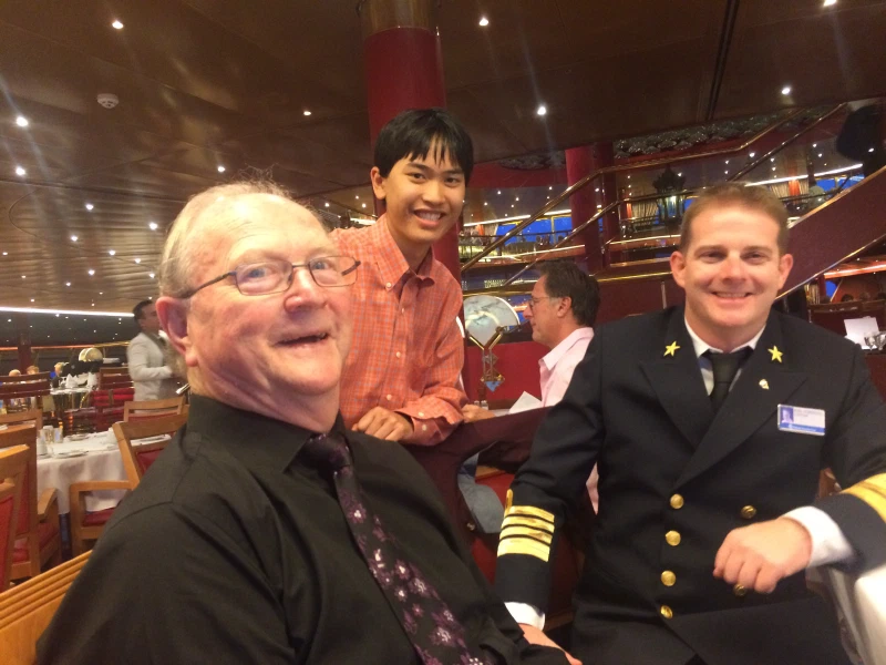 Near the end of dinner, Captain Noel O’Driscoll, the captain of the ship, came by to say hello to his parents. We were introduced to him and had a nice conversation. During our conversation we asked him how much clearance we had under Confederation Bridge. He said two metres (6.6 ft). For a ship of our size, that’s not that much clearance. In fact, they had to lower one of the ship’s antennas to be able to pass under safely. I was able to get a picture with the Captain and his father.