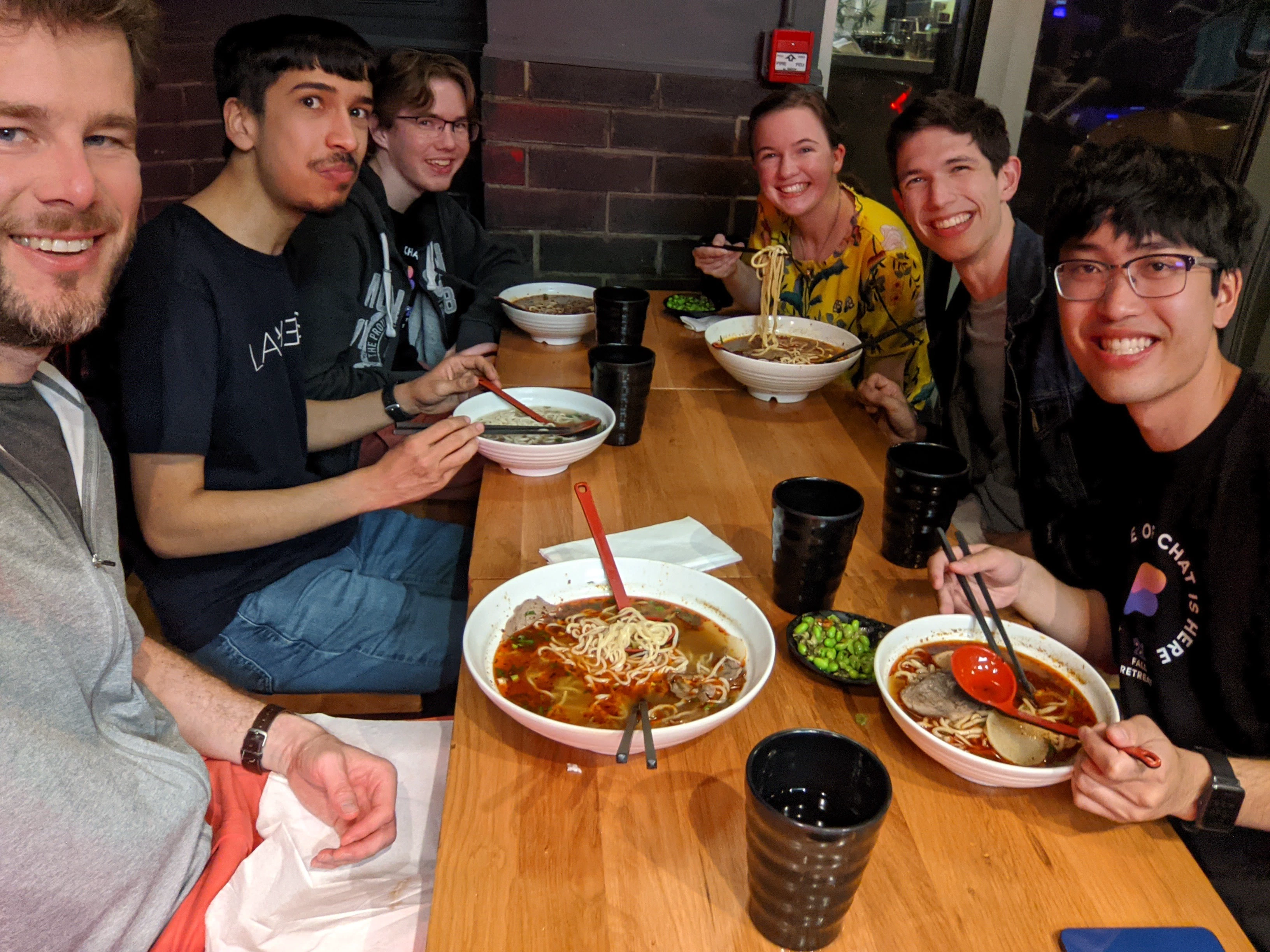 Caroline, Kilian, Eric R, and myself eating ramen. | Tulir, Scott, Caroline, Ian, Kilian, Eric, Alex eating ice cream. |