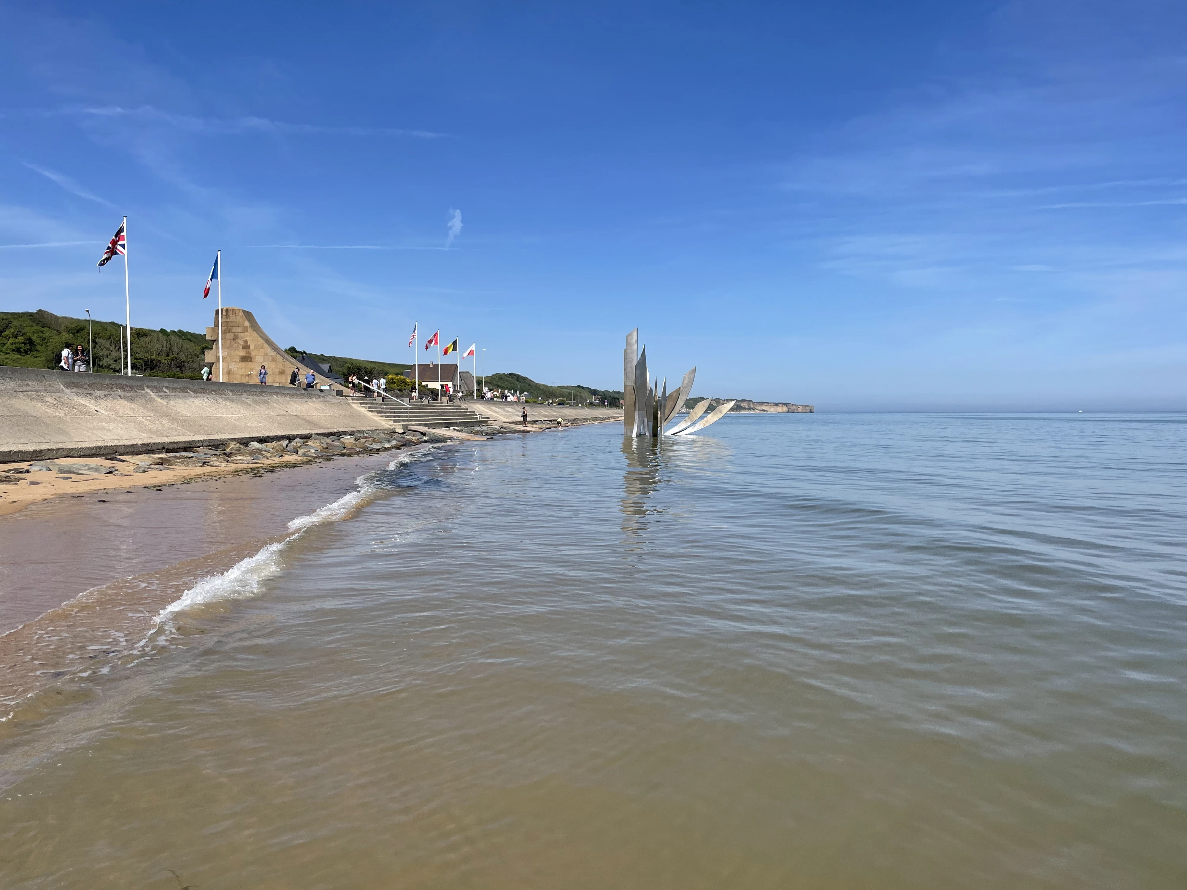 The monument above the seawall commemorates the American troops who landed at Omaha to begin the liberation of Europe.