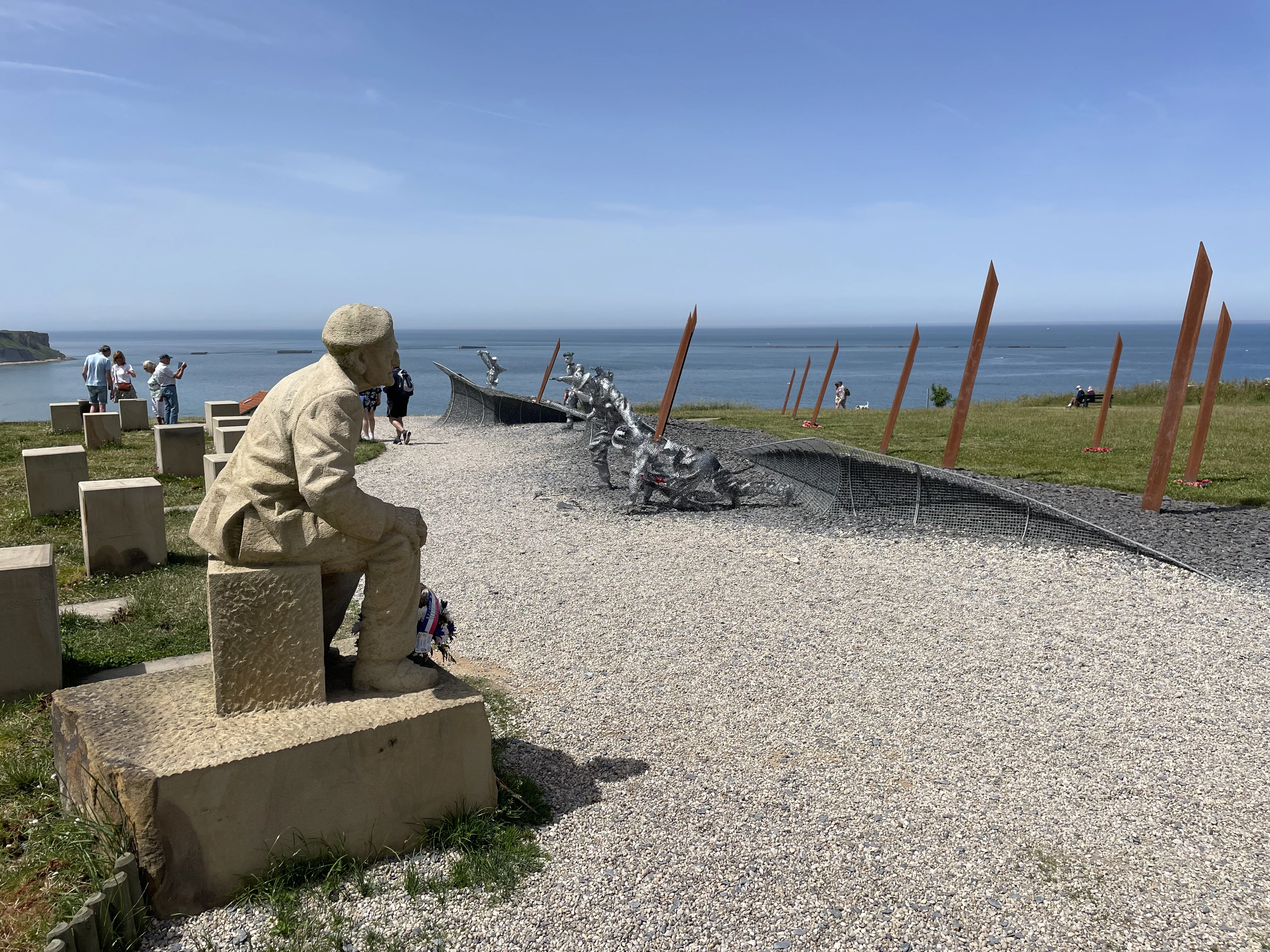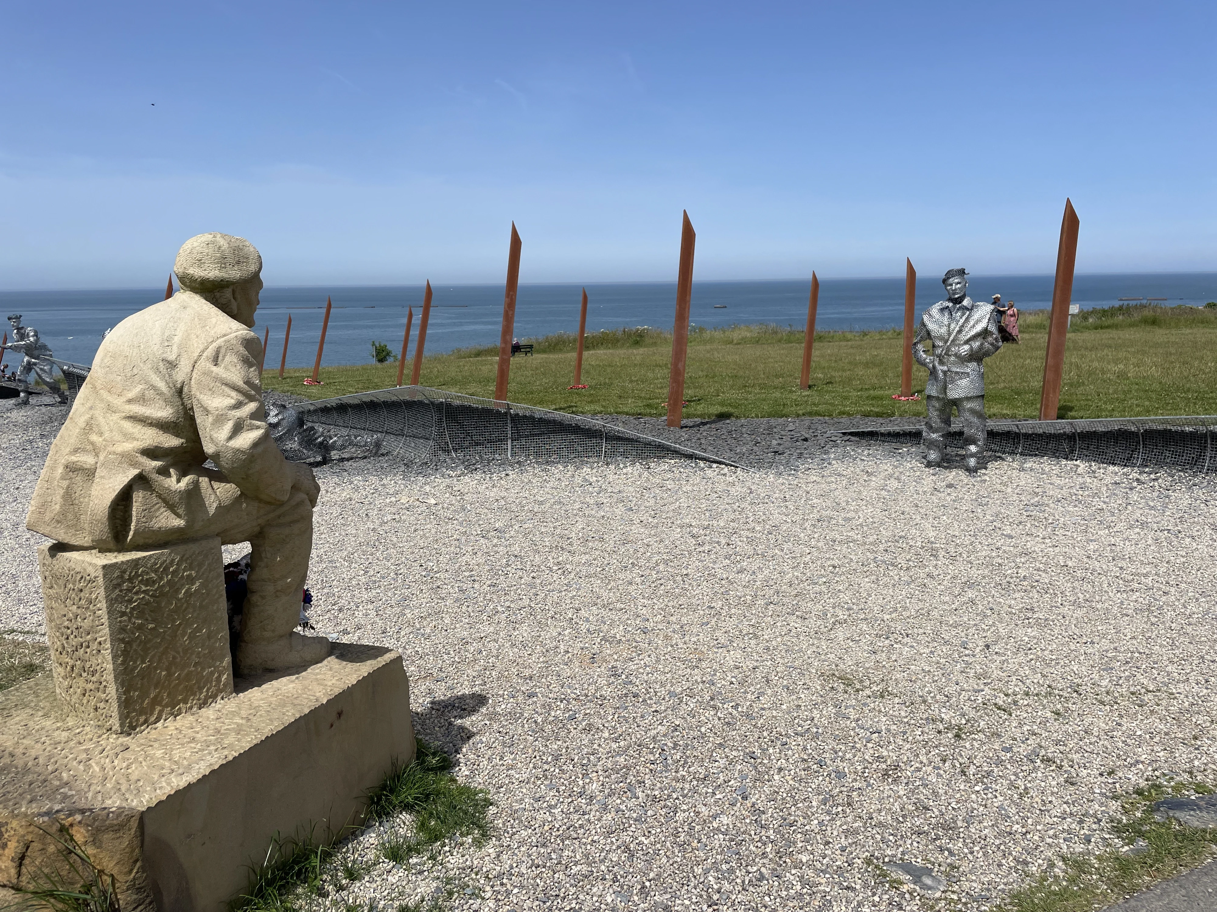 The second thing that was very impactful was a statue of a D-Day veteran looking at his younger self emerging from the waves on the beach. The younger version of the veteran was formed from welded-together bolts, and only the front was formed, evoking a sense of ephemeralness. Further down the metal sculpture were similar representations of men emerging from the waves onto the beach. The way the sculpture was crafted, from one angle you could see the man being represented, but from another angle, the figure could almost be mistaken for a pile of debris.