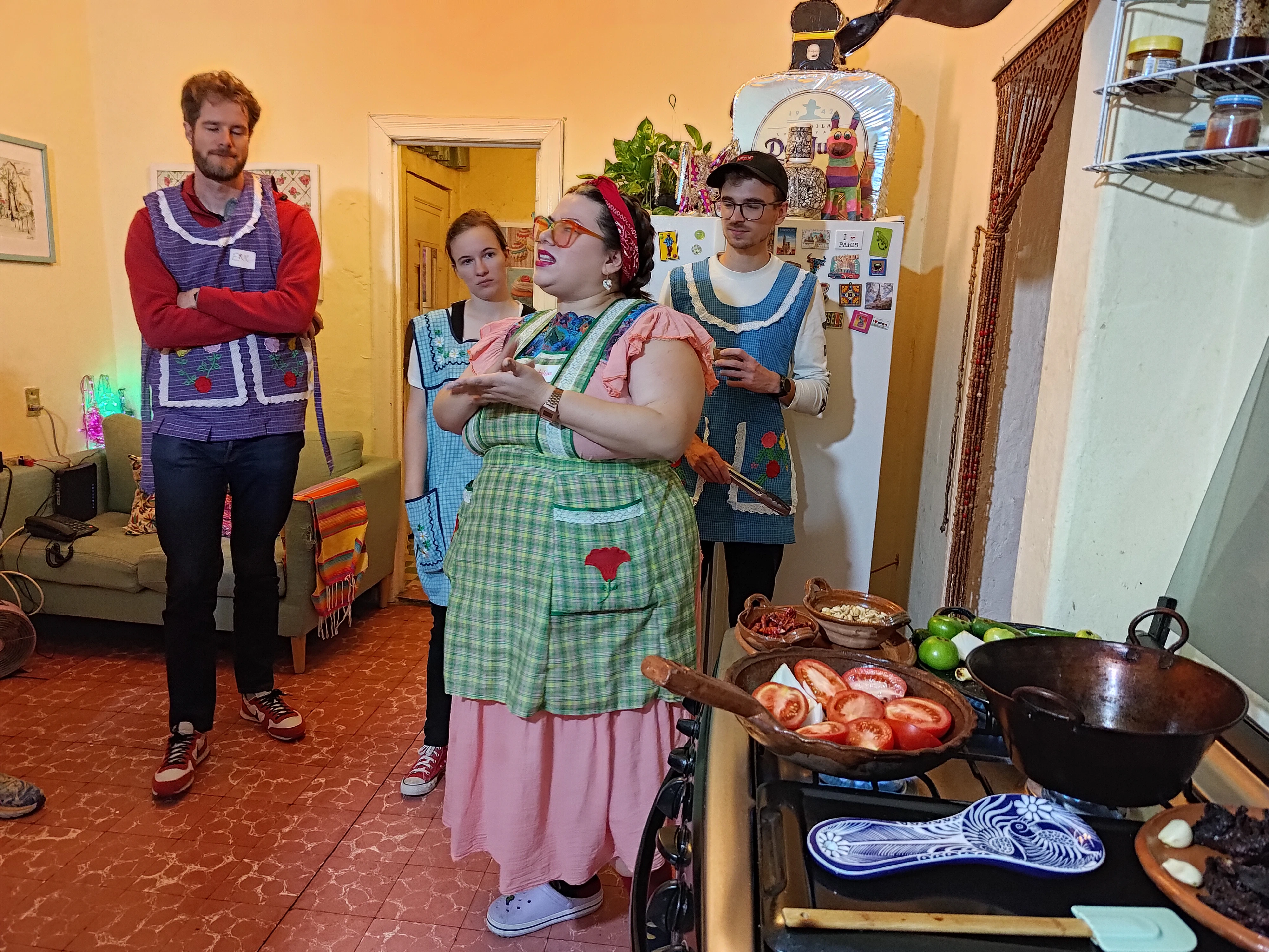 Natalia explaining one of the salsas we were cooking We even got to wear fun colourful aprons while we made the salsas! It was amazing how delicious they were with such simple ingredients. | Fixing quesadillas to to eat with the salsas The best part of the evening was that we got got to eat the fruit of our labours :) I especially enjoyed the chilli oil and creamy tomato salsas. |