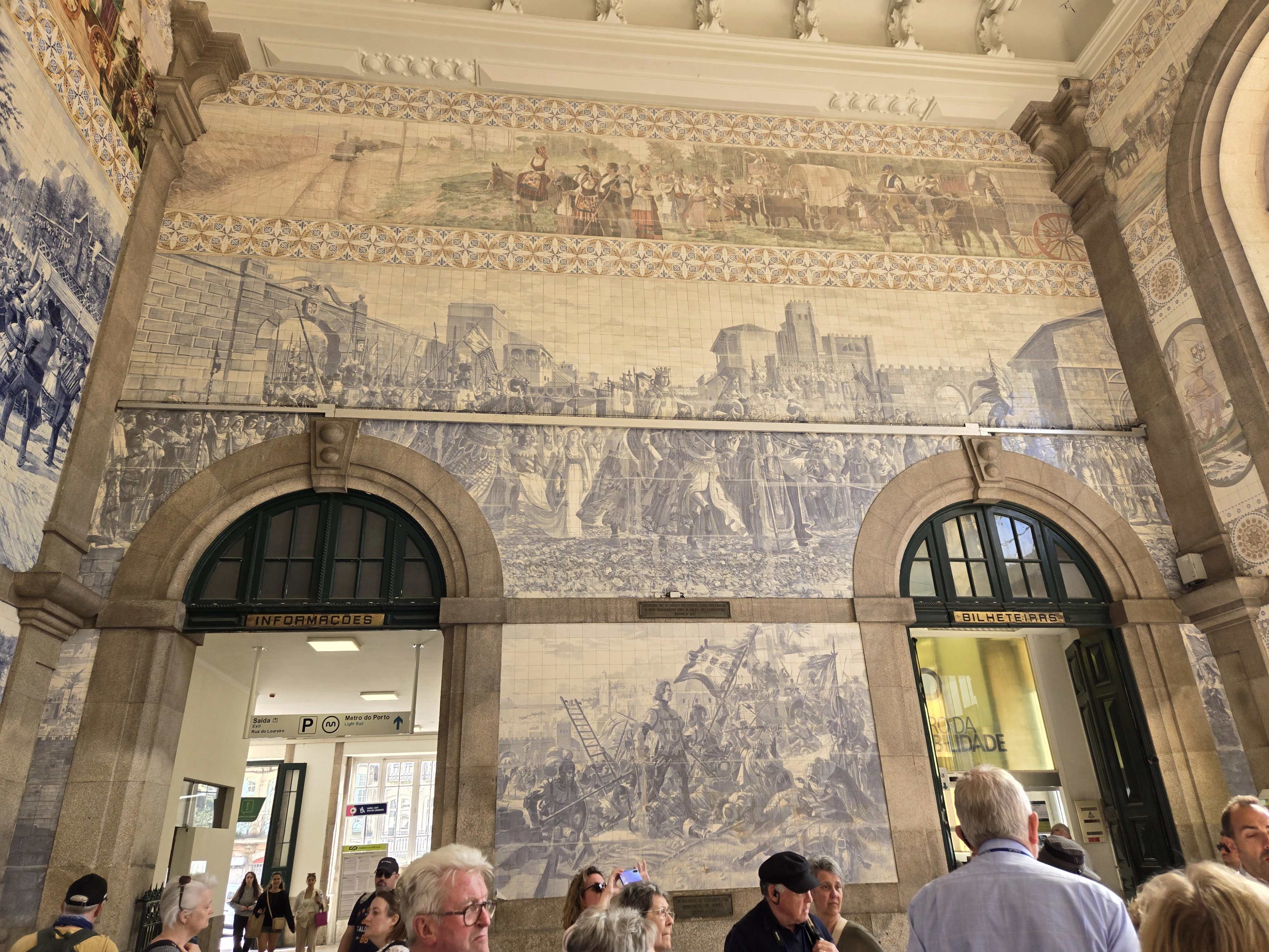 The next stop was at the Porto train station. The entrance is decorated with intricate painted ceramic tiles. The main facades depict military conquests and other historical events such as the arrival of the English king to form an alliance with the Portuguese. Above the main murals are murals depicting the evolution of transportation from horse and carriage to the train.