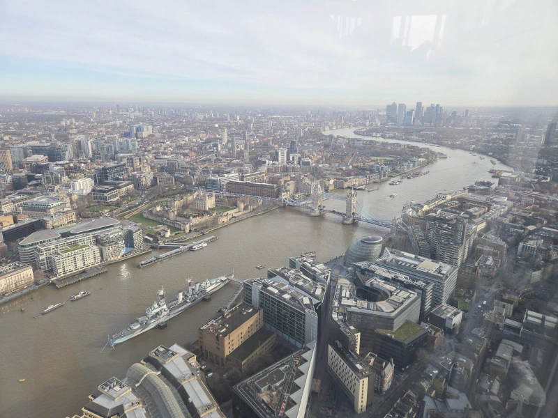 On Wednesday, I visited the Shard. The tallest building in Western Europe. There is an enclosed viewing area and a terrace around floor 70 with views of all of London. You have to take two elevators to get to the enclosed viewing area, and then you have to go up more stairs or an elevator to get to the terrace which is the highest publicly accessible floor.